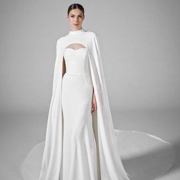 Ilusiónate con este modelo que presenta un elegante corpiño de cuello cisne y manga corta, cubierto de fino encaje con detalles de pedrería. La falda despliega su vuelo con la elegancia de la organza. Añádele una diadema como tocado sencillo para un toque romántico (no incluida en el precio).